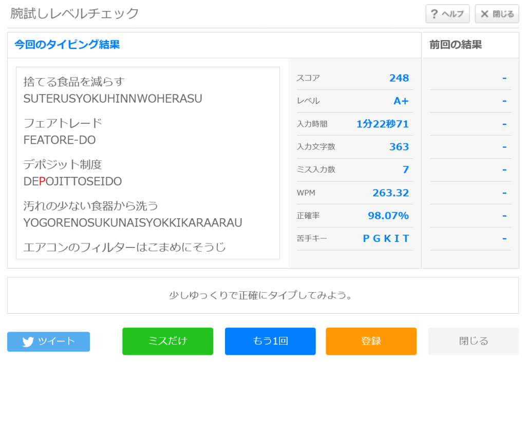 - 普段もそんなにタイピングやらないし、仕事でもコピペの方が多いからしょうがないけど、200後半は安定して出したいから練習するかも。しないかも。