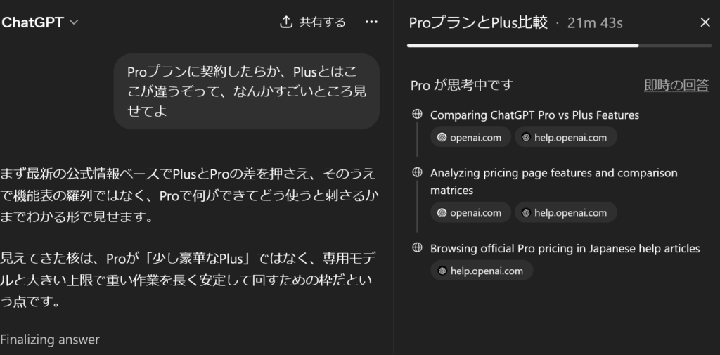 - ChatGPTのProに適当なチャットを送ったら20分以上考えてくれて申し訳なかった。