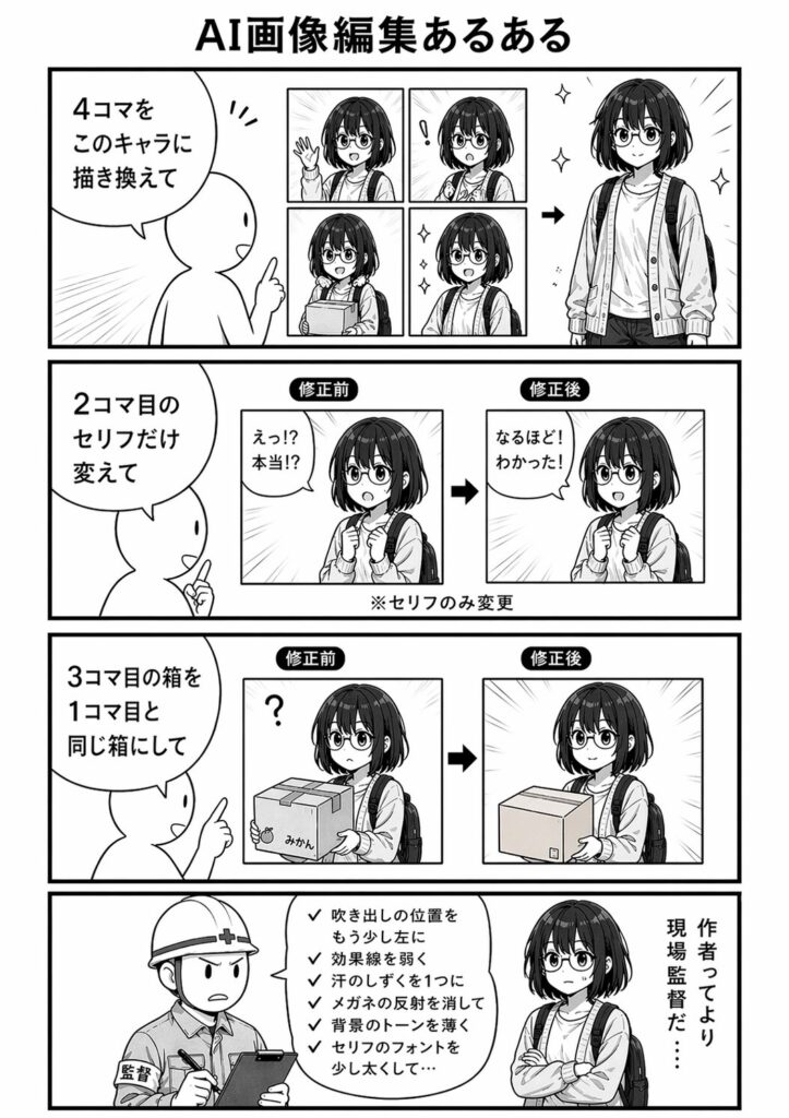 - 4コマの枠のサイズがぐちゃぐちゃだったりするのはご愛敬だけど、イラストにまとめたり、パワーポイントの代わりとして使ったり、有用でしょうね。僕はそんなに使えてないです。