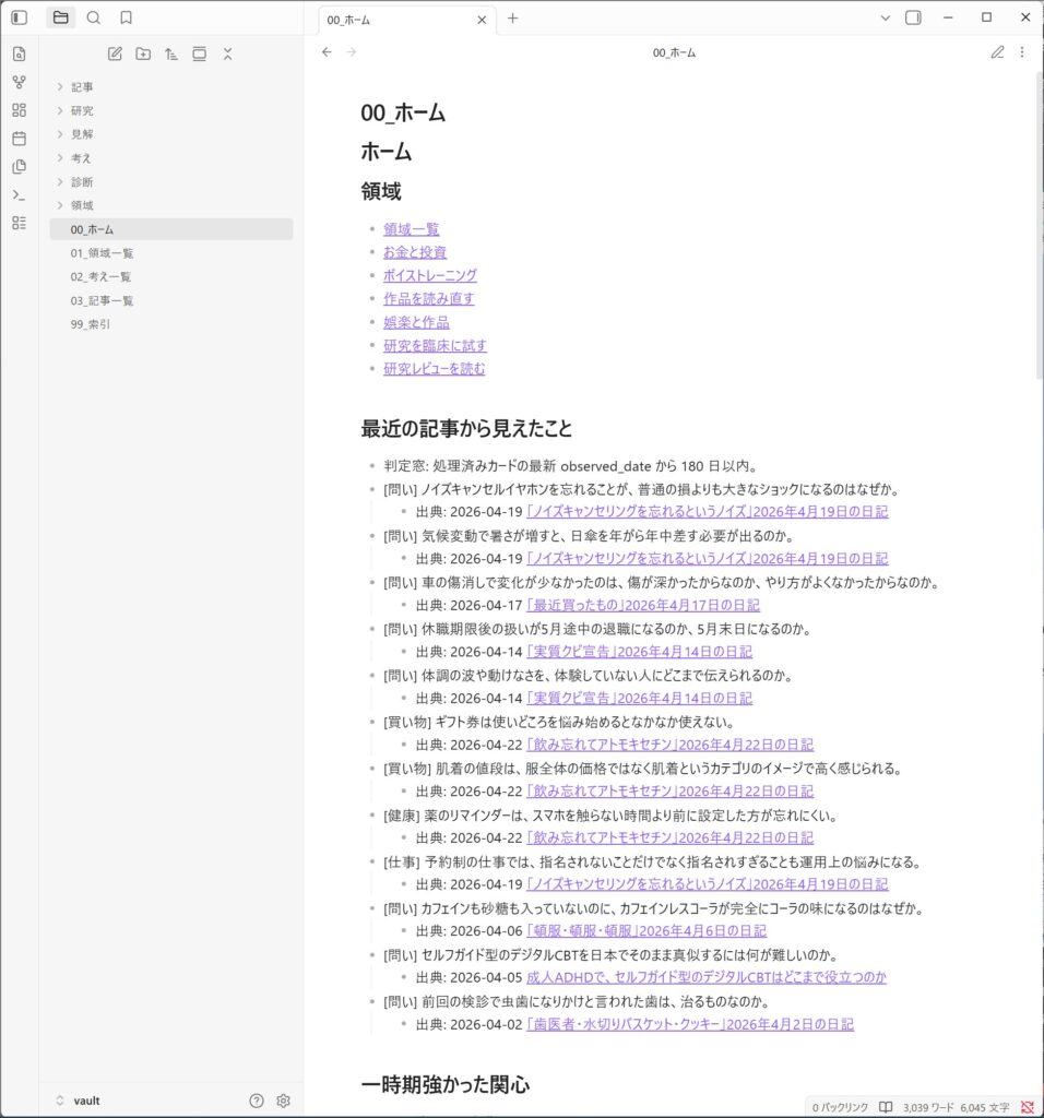 - 最近はObsidianというソフトとCodexを使って、自分用のwikiのようなものを作ろうとしています。